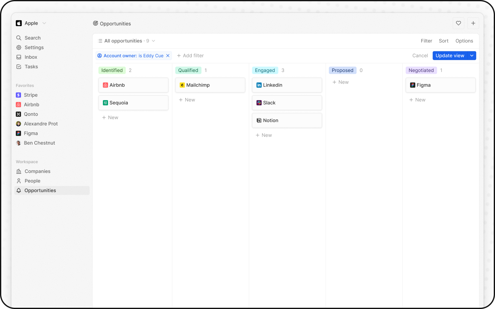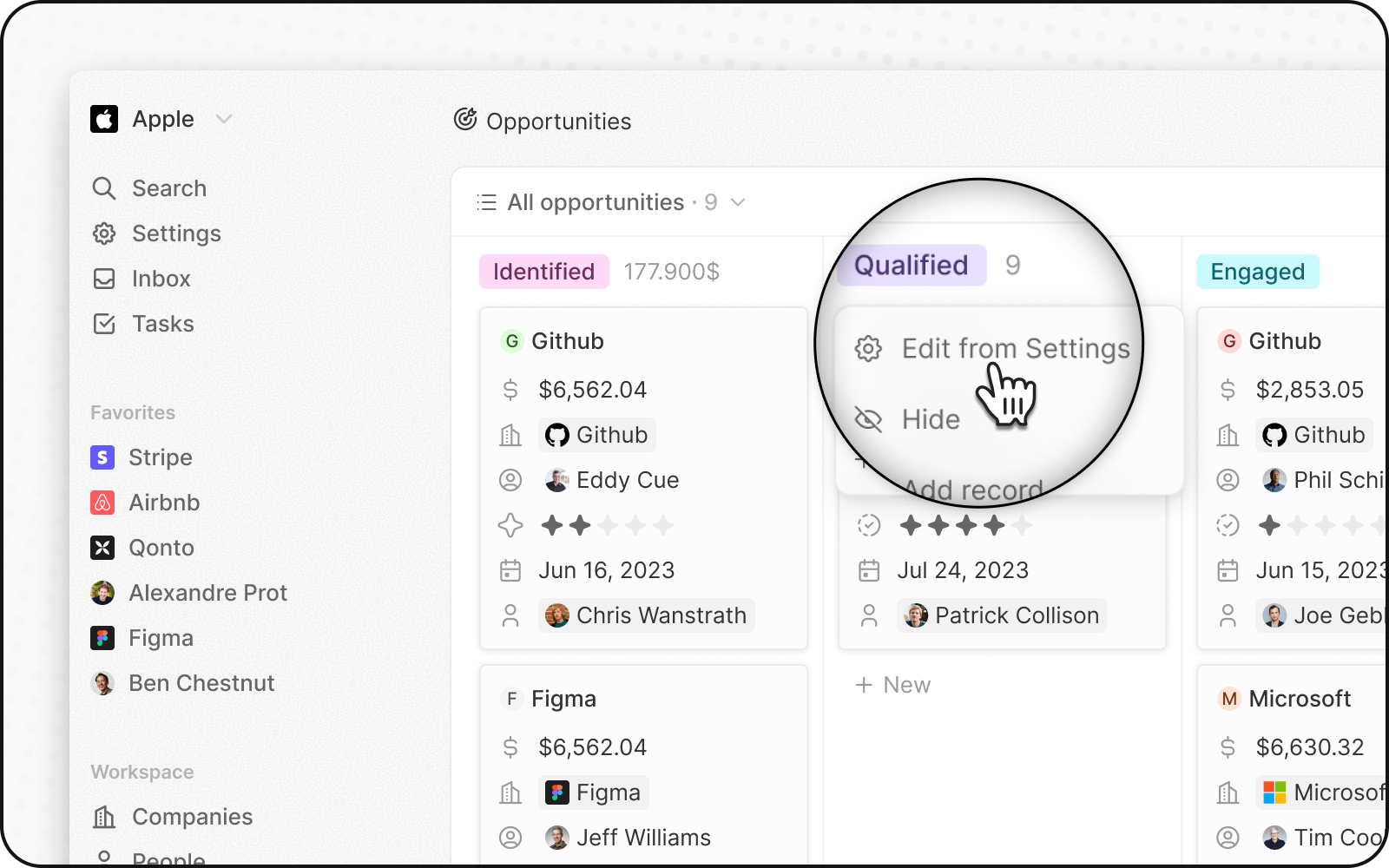 Vous pouvez déplacer chaque opportunité entre les étapes à mesure qu’elle progresse dans votre processus de vente en la glissant-déposant. Maintenez le clic sur une carte et déplacez-la à l’étape suivante.Personnaliser vos étapes de pipeline