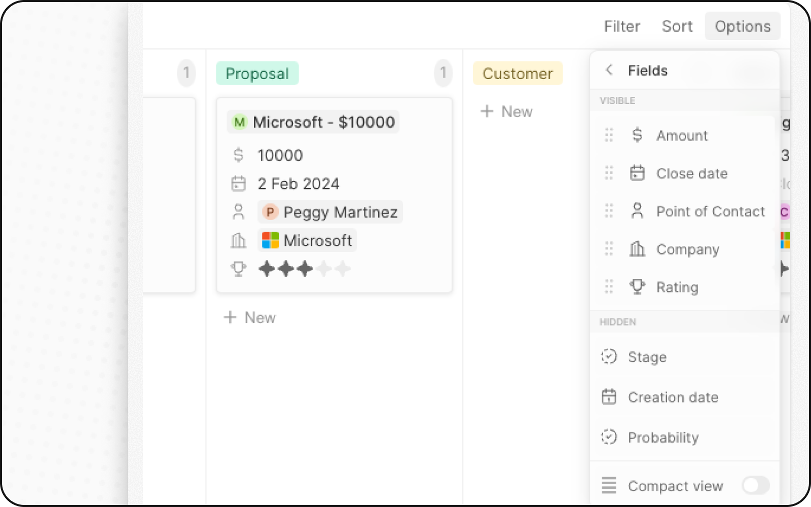 Vous pouvez également masquer tous les champs et obtenir une vue d’ensemble de toutes les opportunités en un coup d’œil. Pour ce faire, cliquez surOptions en haut à droite et activez le bascule pour la Vue compacte après avoir sélectionné la mise en page en vue kanban.
