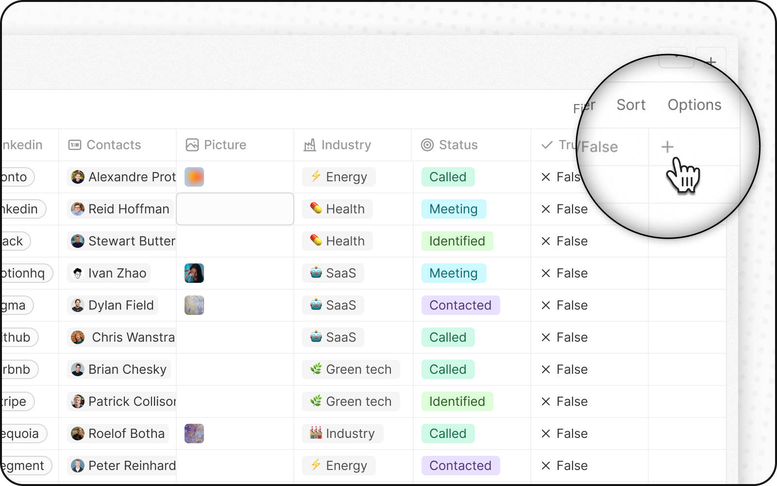 Pour créer un champ personnalisé, cliquez sur le bouton + à l’extrémité droite des colonnes du tableau et sélectionnez Personnaliser les champs.