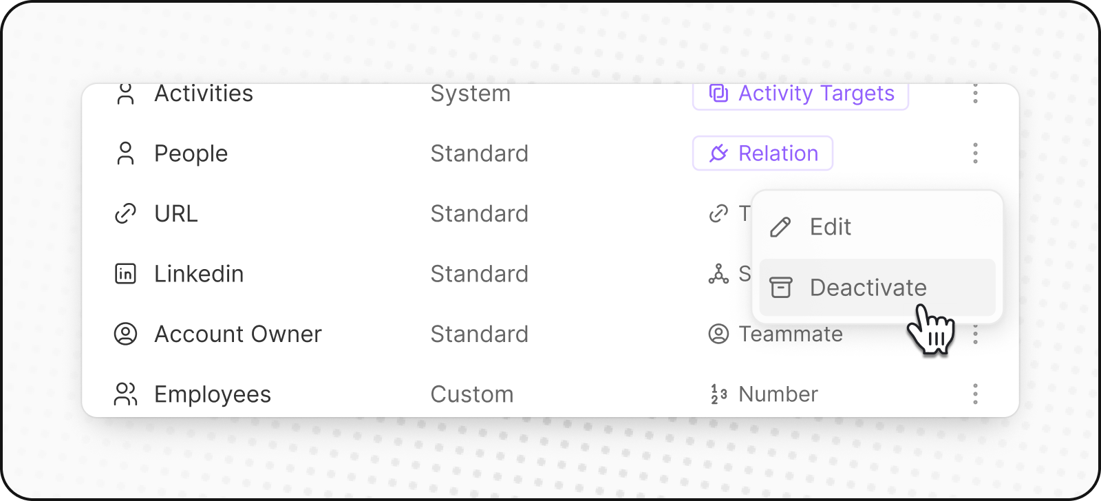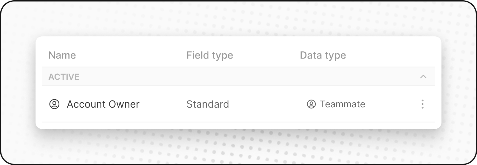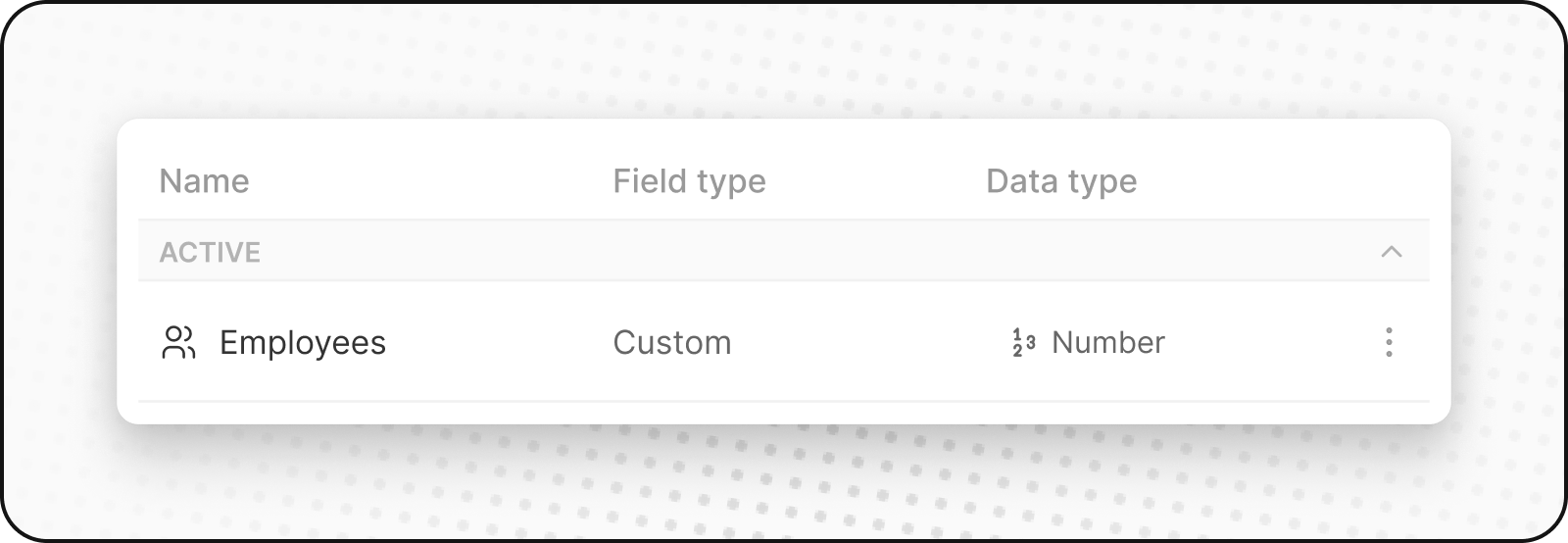 Les champs personnalisés peuvent être ajoutés à n’importe quel objet. Vous pouvez stocker du texte, des chiffres, des dates, des sélections déroulantes, et plus encore. Utilisez les champs personnalisés pour suivre des informations spécifiques à votre entreprise. Par exemple, un champ personnalisé pour SpaceX pourrait êtreStatut Actif de la Fusée, indiquant si une fusée est opérationnelle.