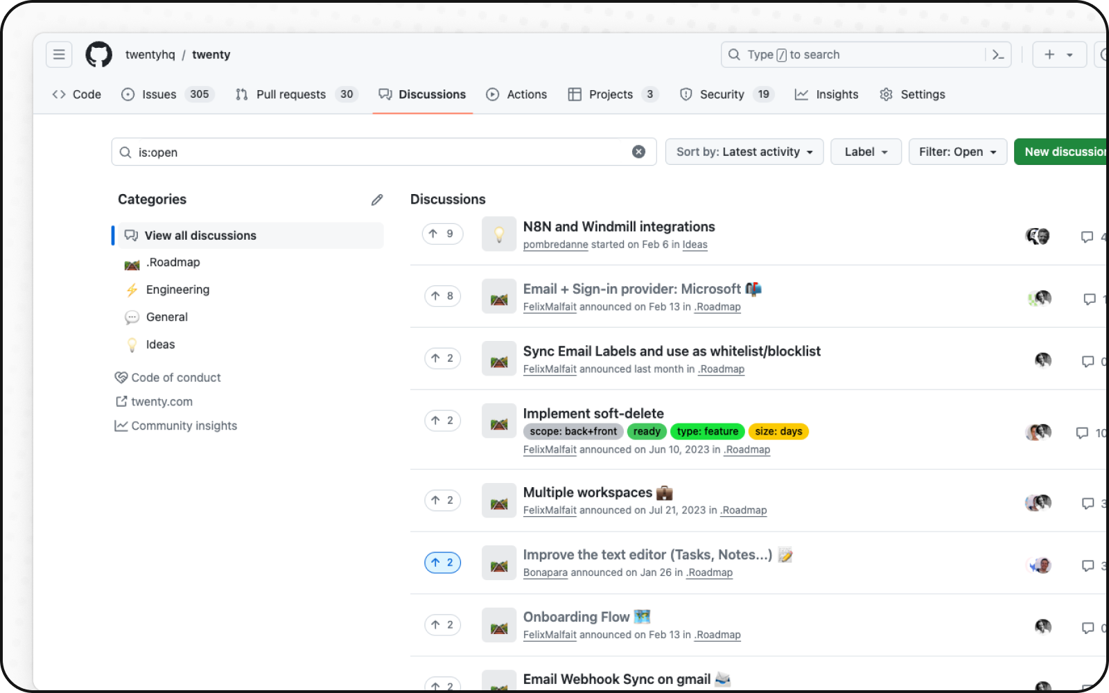 The Twenty GitHub repository hosts a vast array of resources like source code, documentation, discussions, and issue tracking. This is where you will be able to access the full code behind Twenty. Visit Twenty on GitHubContributing