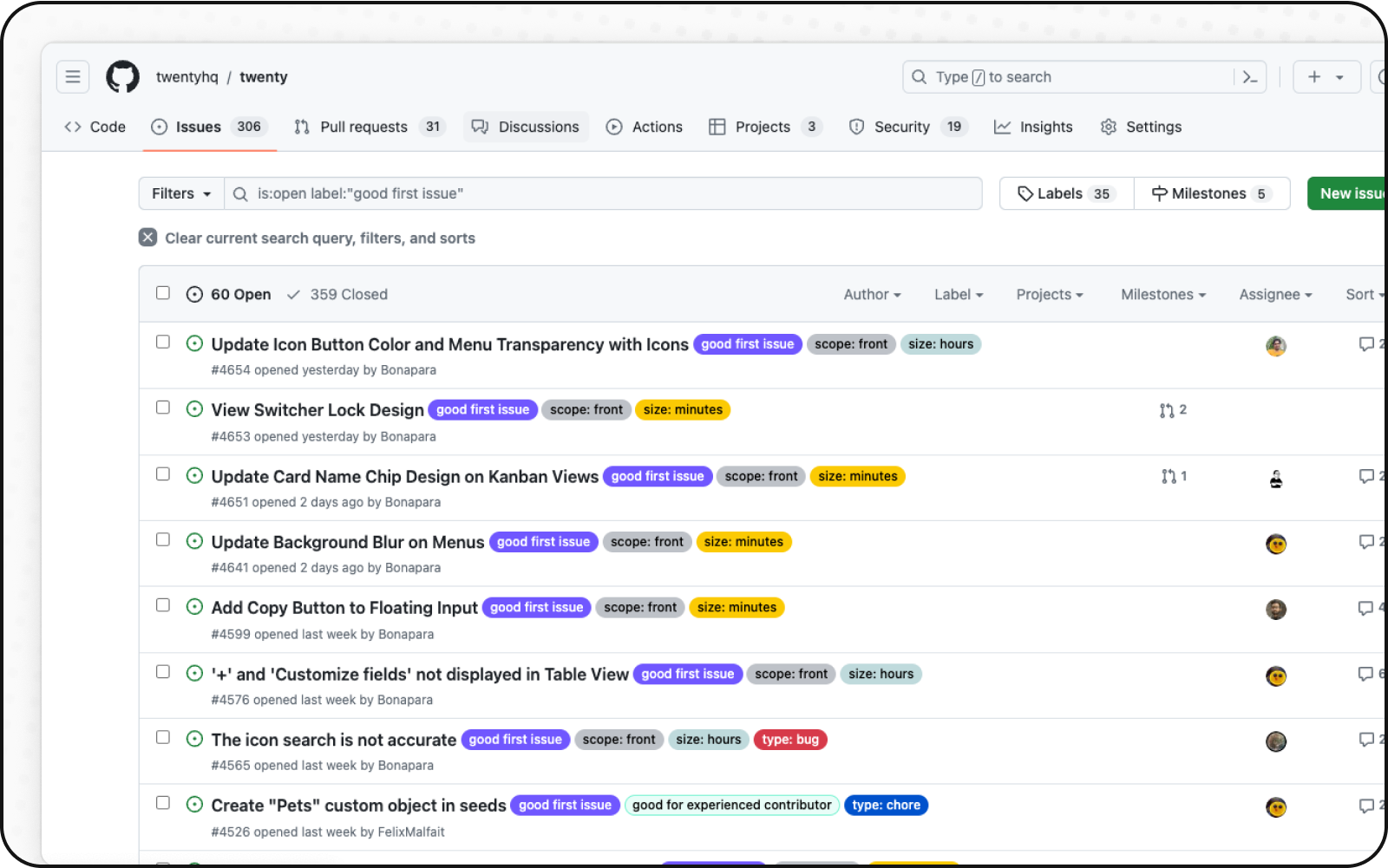 Start your journey by finding beginner-friendly tasks:- Navigate to the Issues tab on the Twenty repository.