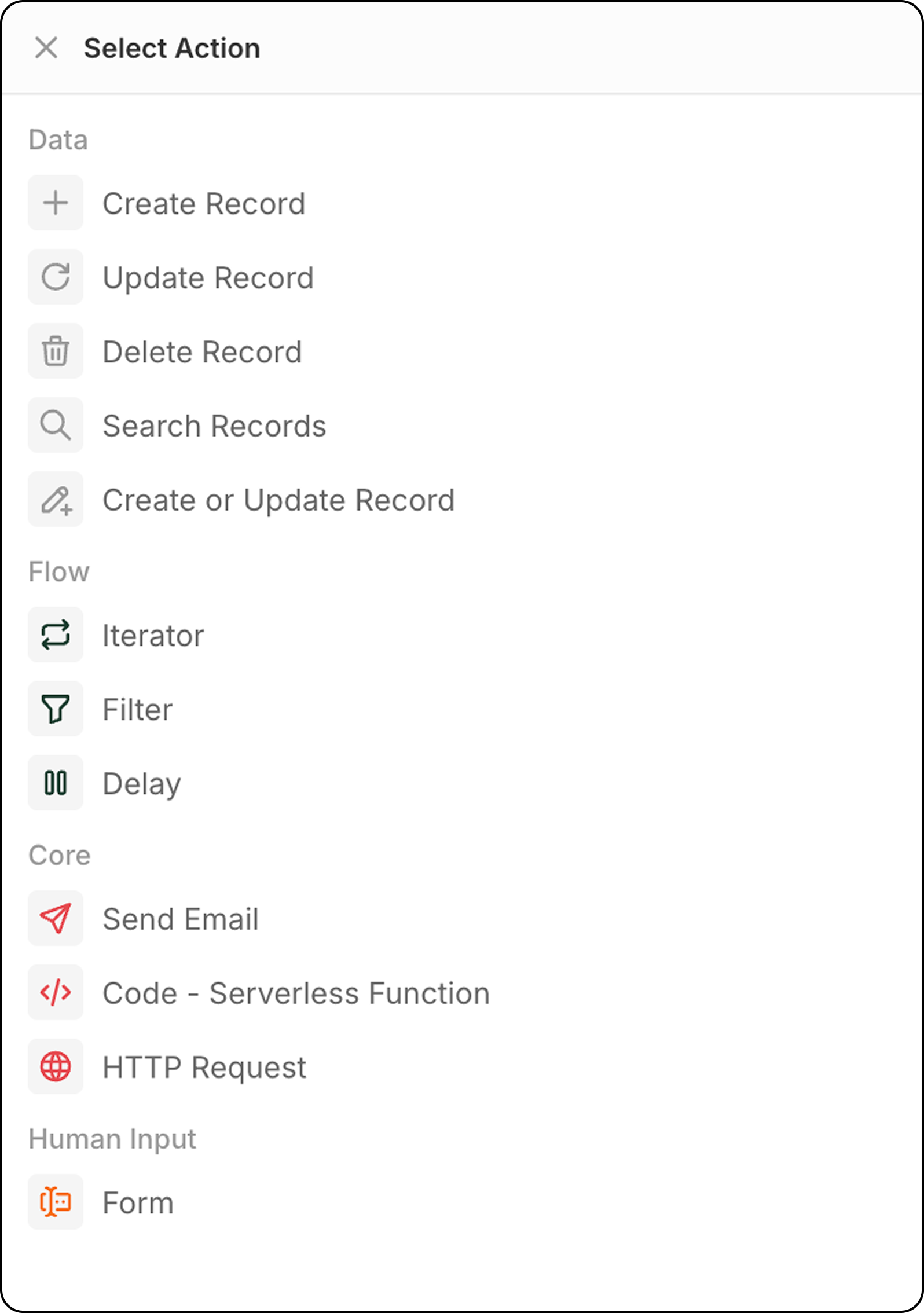 Prompts a form during workflow execution to collect user input. The responses can then be used in subsequent steps to create records, send emails, or execute any other action based on the input.